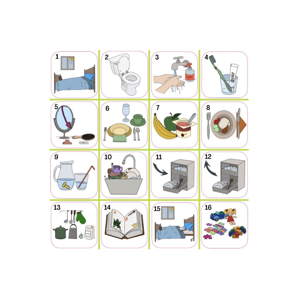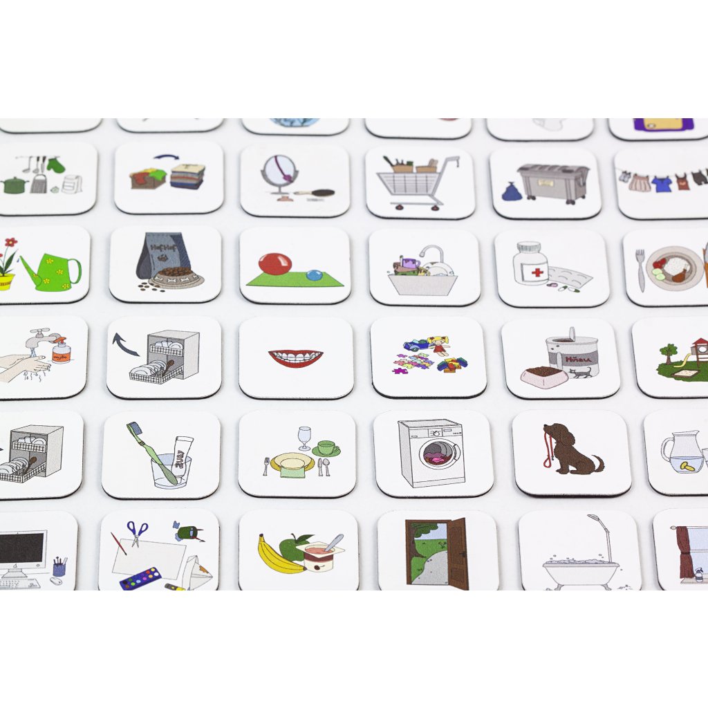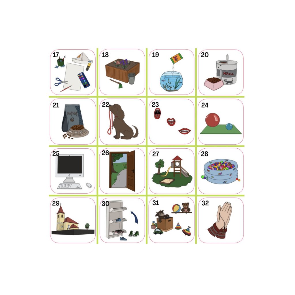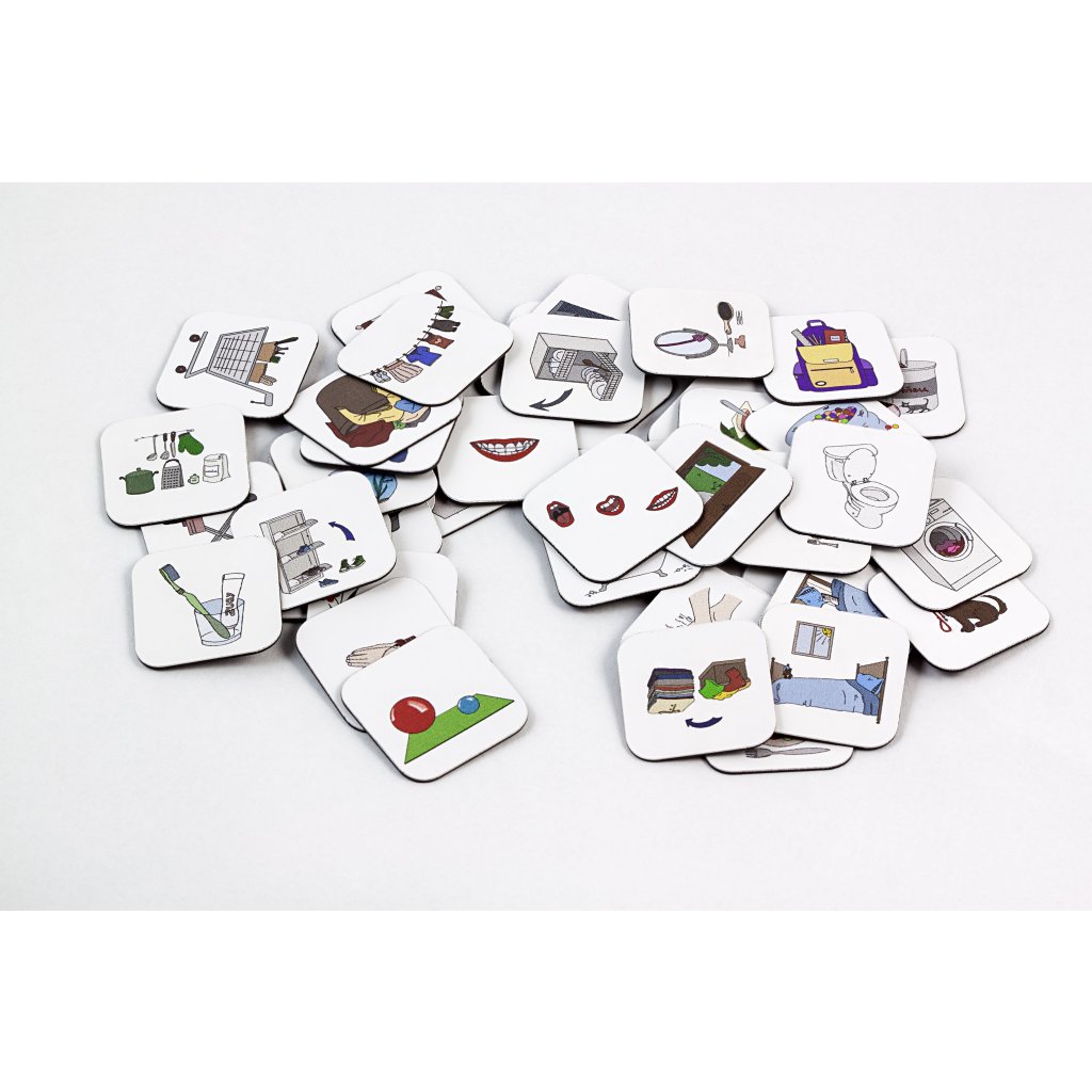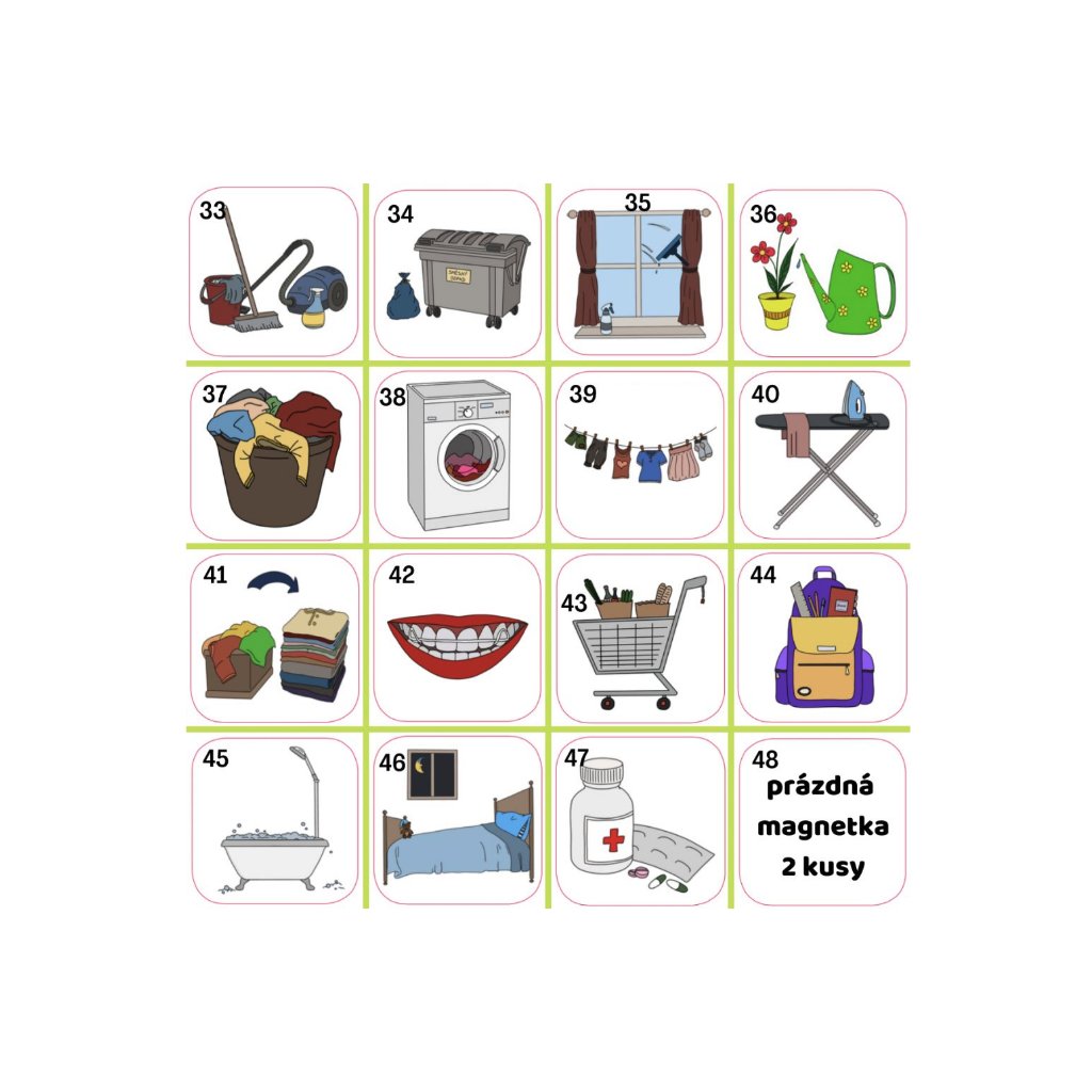 Sada č. 7: chybí magnet: kostel, léky, nákup, rovnátka, venčení psa, mytí oken, tvoření, procházka, zahradničení, sušení prádla, krmení psa / náhradní za ně: mytí rukou, oslava, úklid hraček, procházka, cvičení, výlet, hřiště, návštěva lékaře, prarodiče, divadlo, babička