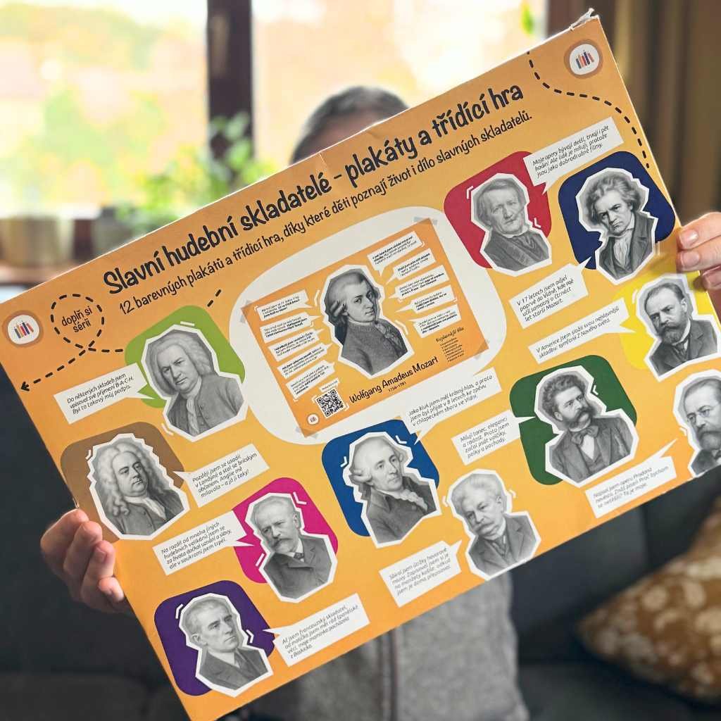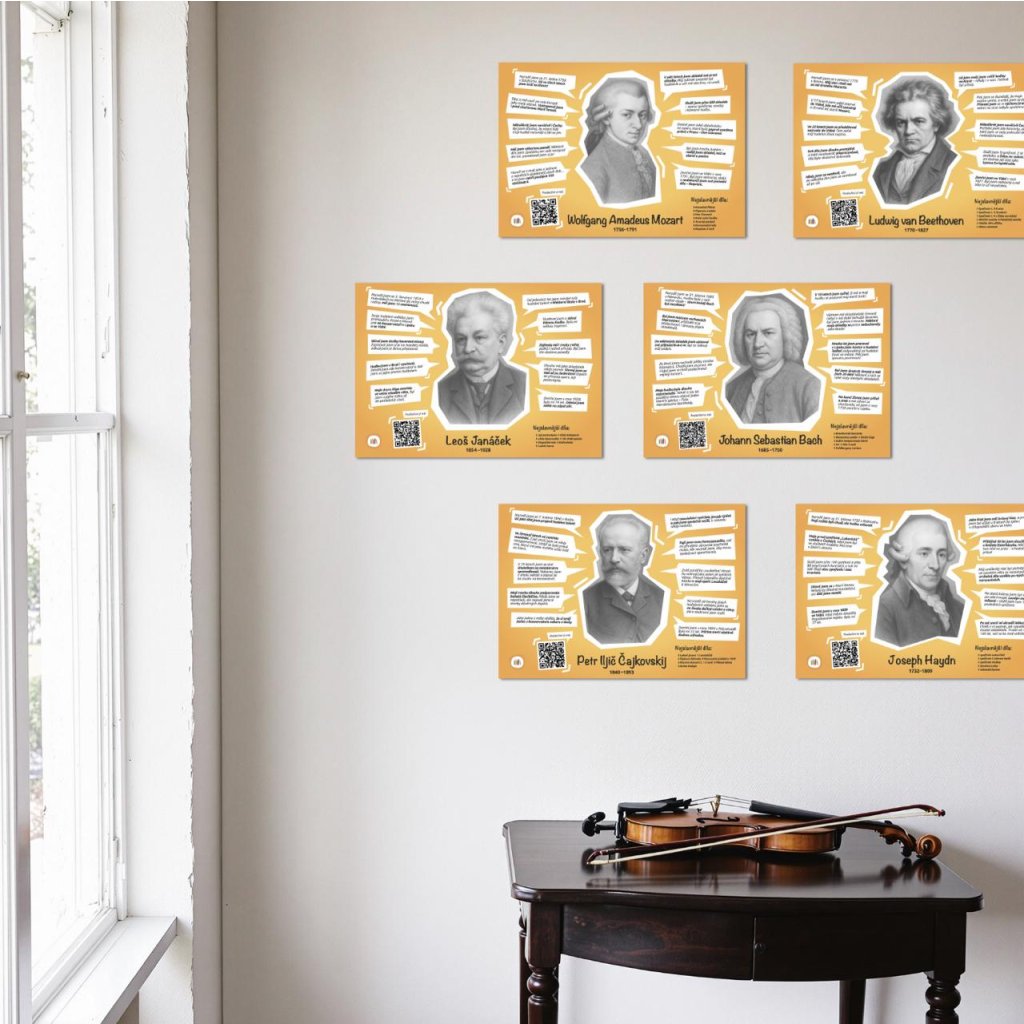 Na každém z 12 plakátů najdete portrét slavného skladatele a 12 komiksových bublin, ve kterých vypráví o svém životě a tvorbě. Nechybí seznam jejich nejznámějších skladeb a QR kód s hudební ukázkou – děti si tak mohou hudbu rovnou poslechnout. Plakáty jsou vytištěné na kvalitním tvrdém papíře, který vydrží i rušnější školní prostředí. K dispozici dostanete dostatečný počet oboustranných samolepek pro pevné uchycení plakátů na jakýkoliv povrch.