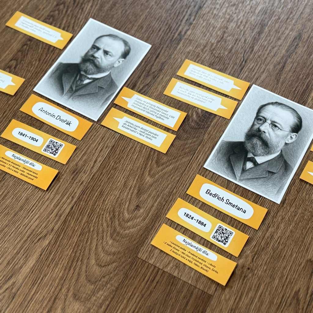 Zahrajte si pexeso – děti hledají dvojici portrét + text. Varianta: hledání dvojice jméno skladatele + jeho dílo. -