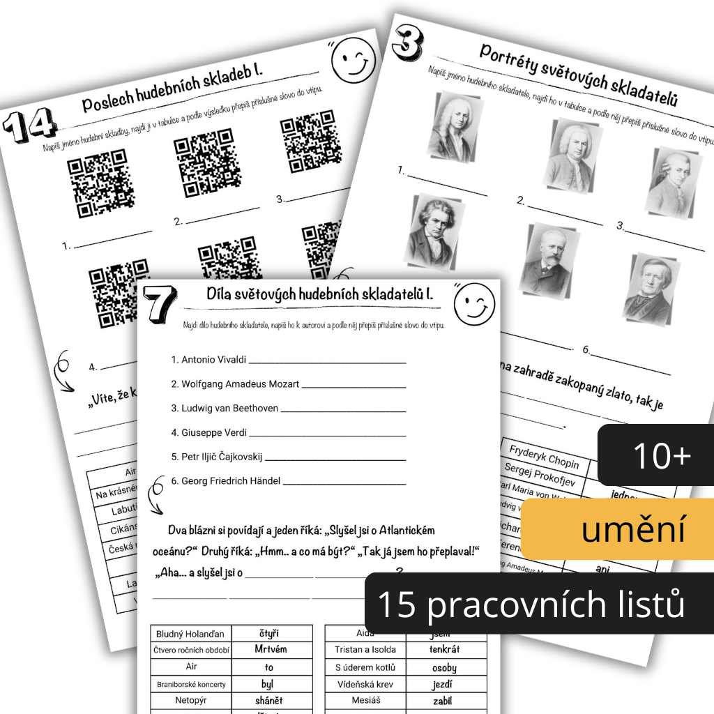 15 originálních pracovních listů na téma hudební výchovy (portréty českých i světových skladatelů, úkoly zaměřené na poslech a poznávání jejich děl, cvičení na rodná města a země skladatelů, určování hudebních žánrů)